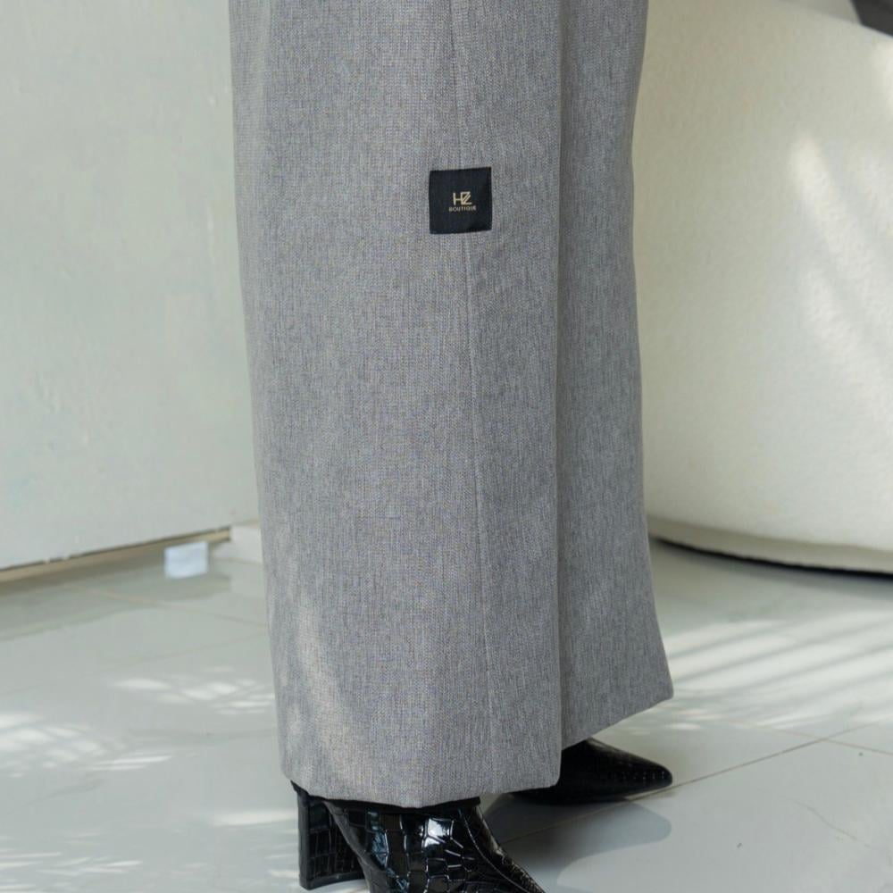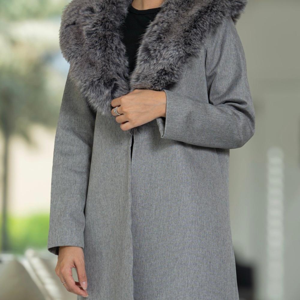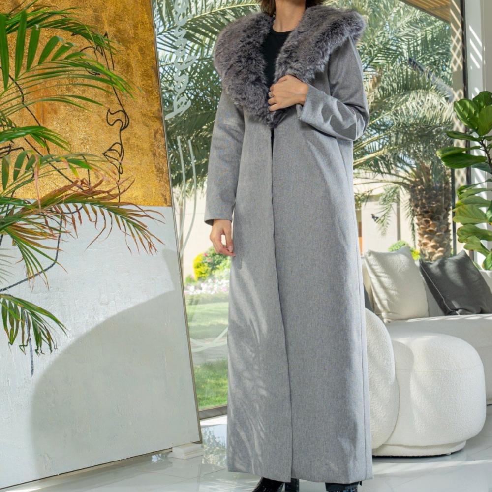 شانيل رمادي مع فرو إيطالي فاخر على الياقة، بتصميم طويل يبرز نعومة الخامة وهدوء اللون، ليمنح حضورًا شتويًا أنيقًا.